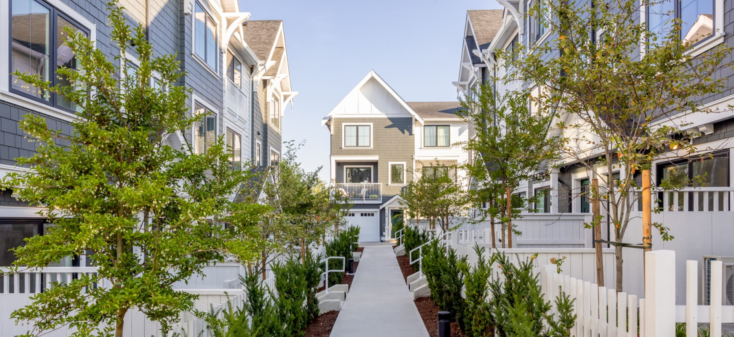 Welcoming exteriors provide an immediate sense of arrival, with traditional architectural influences inspired by that of a single-family home. Yard spaces are encompassed by pleasing white picket fences and lush landscaping reflective of the area’s surroundings. A considerate site design maximizes light and outdoor space for each home while establishing privacy between neighbours and encouraging social interaction.